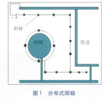 分布(bu)式(shi)陽極(ji)可有效地改善電(dian)(dian)流分布(bu),使保(bao)護(hu)(hu)結構(gou)上(shang)的電(dian)(dian)位均勻分布(bu)。當(dang)陰極(ji)電(dian)(dian)纜(lan)或(huo)管道太(tai)長時,應(ying)考慮其電(dian)(dian)阻對電(dian)(dian)流的影(ying)響。必(bi)要時,可以另加陰極(ji)電(dian)(dian)纜(lan)和陽極(ji)電(dian)(dian)纜(lan)。保(bao)護(hu)(hu)結構(gou)復雜時,經常采(cai)用(yong)分布(bu)式(shi)陽極(ji),見(jian)圖1。