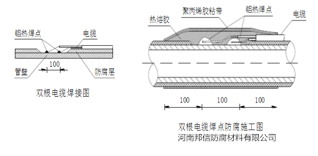 ⑦電(dian)纜(lan)與管(guan)道連接(jie)(jie)、電(dian)纜(lan)與帶狀陽(yang)極(ji)的連接(jie)(jie)均(jun)采(cai)用(yong)鋁熱焊(han),應對連接(jie)(jie)處的防腐進(jin)行檢查。